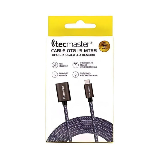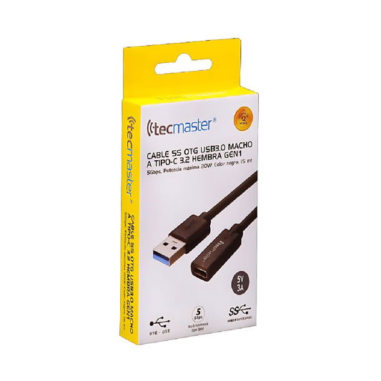 Cable Tecmaster OTG USB 3.0 Macho a Tipo-C 3.2 Hembra 5 Gbps 20W 1.5 mts